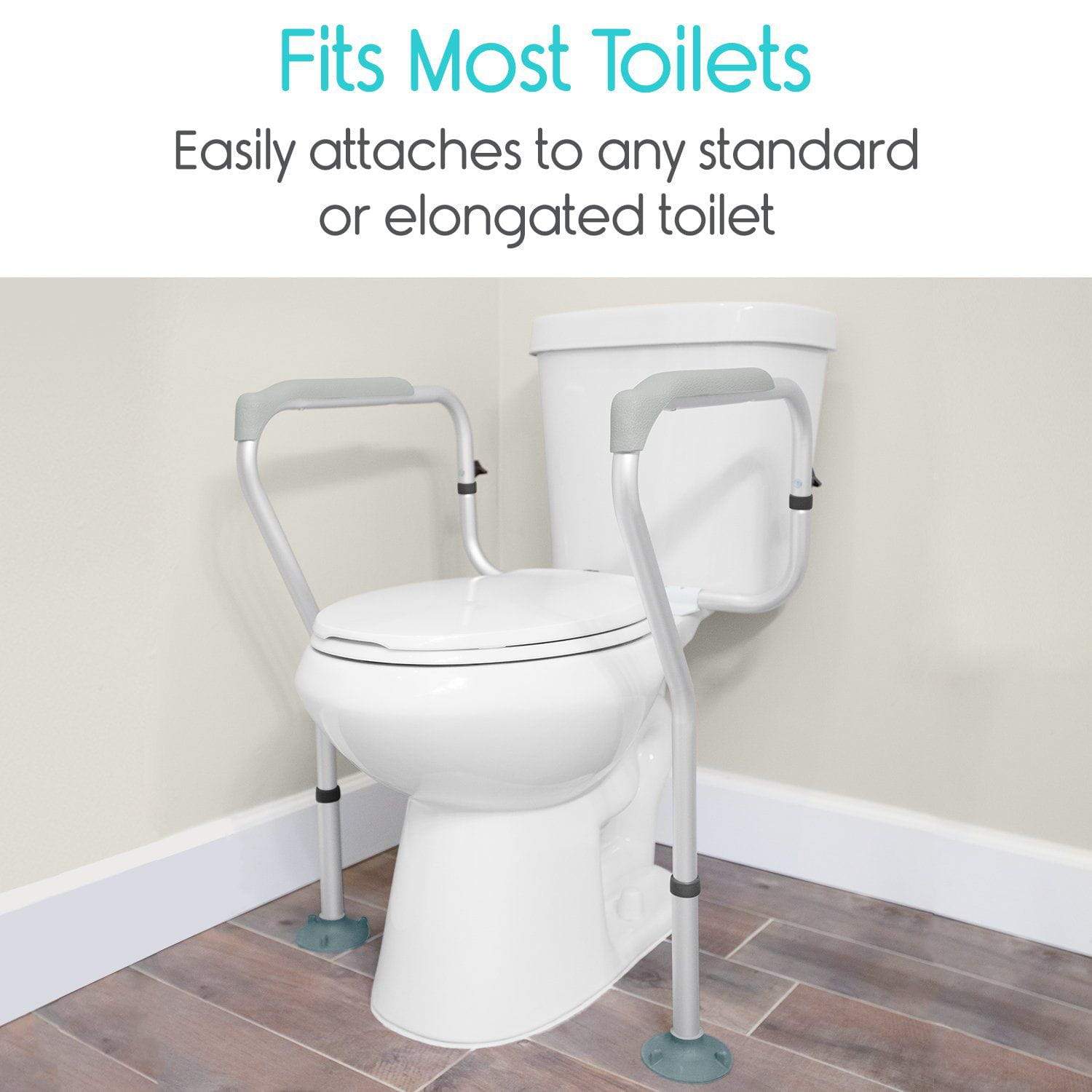 The toilet safety rail can be used with any toilet, standard or irregular. Rail handles easily adjust in height and width for a customized fit for every household. Handles can be adjusted from 21.5” to 26.5” wide providing a comfortable amount of space above the toilet. The rail handle height is also adjustable from 26” to 31.5” and each leg is capped with a strong suction cup tip for additional safety and convenience.