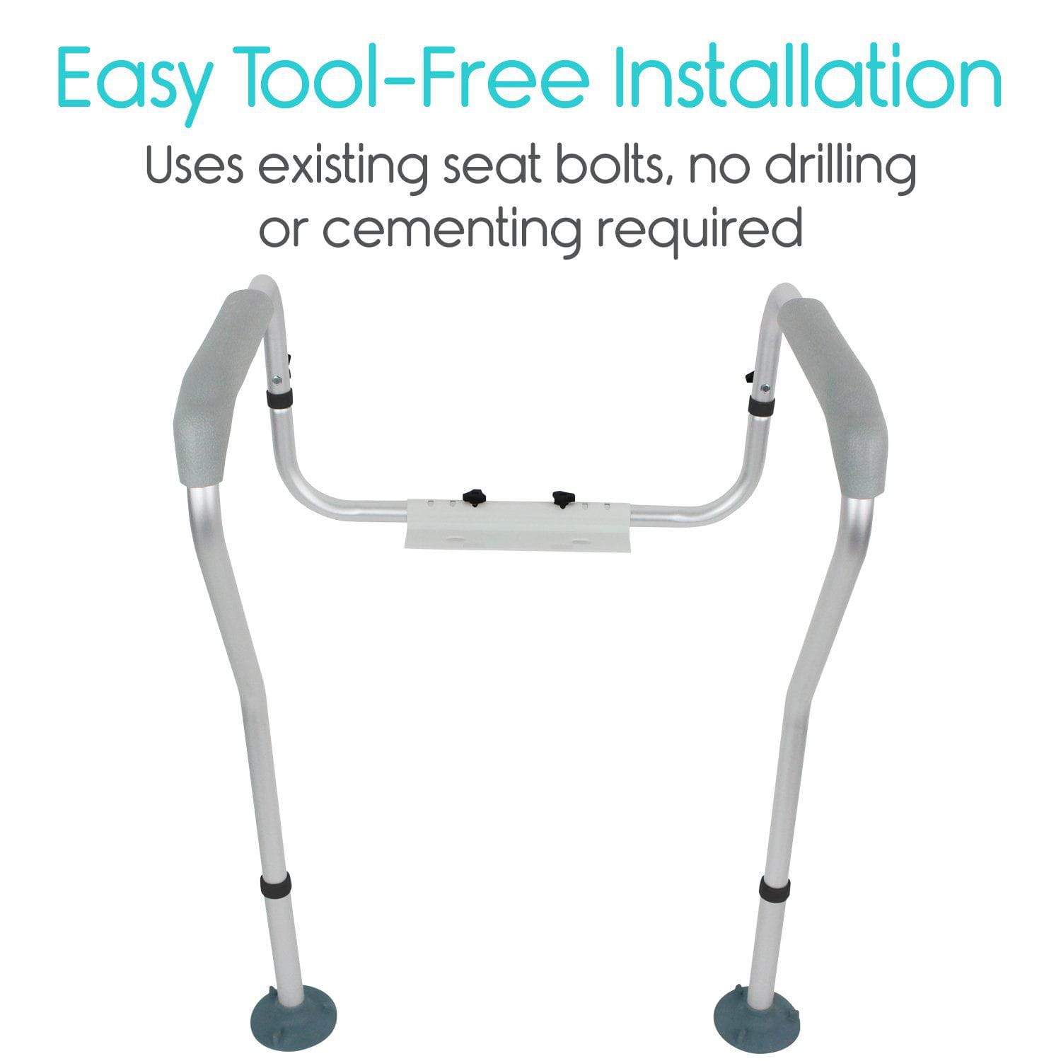 Easy to assemble and install, the durable toilet rails work with most toilets, standard and irregular. No drilling or cementing is required. The rails are installed and removed by utilizing the existing seat bolts. Lightweight and durable, the aluminum frame is also corrosion-resistant, perfect for long-term use. -